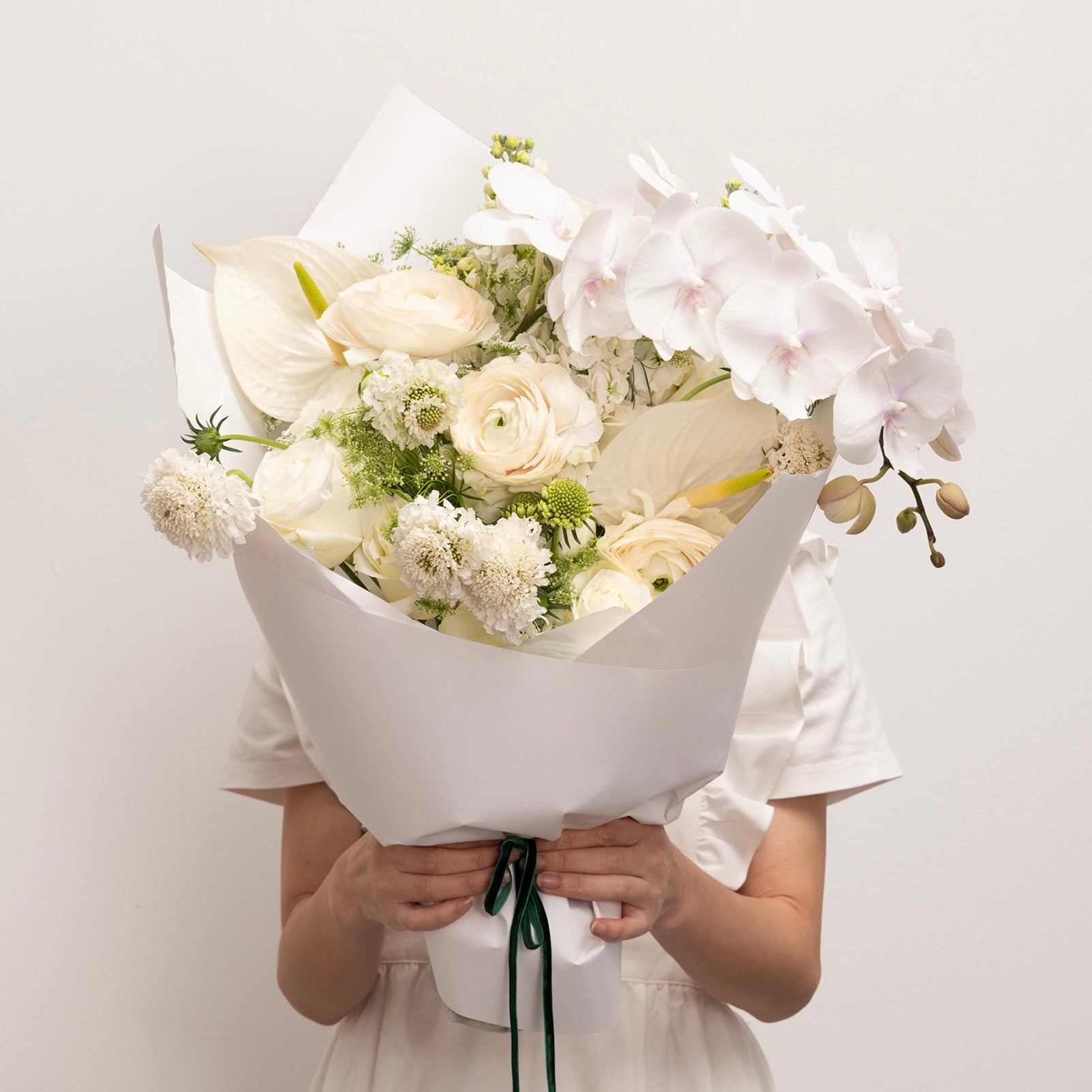 Her Favourites is a refined white and cream bouquet that brings together the flowers she loves most — graceful phalaenopsis orchids, lush hydrangea, and elegant anthuriums. Harmonious and timeless, this arrangement embodies understated luxury and effortless beauty.